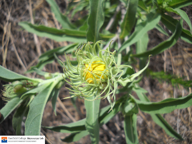 The unopened flower has its ray flowers tightly packed into a yellow dome. You can also see the spiked leafs that give this plant its name.