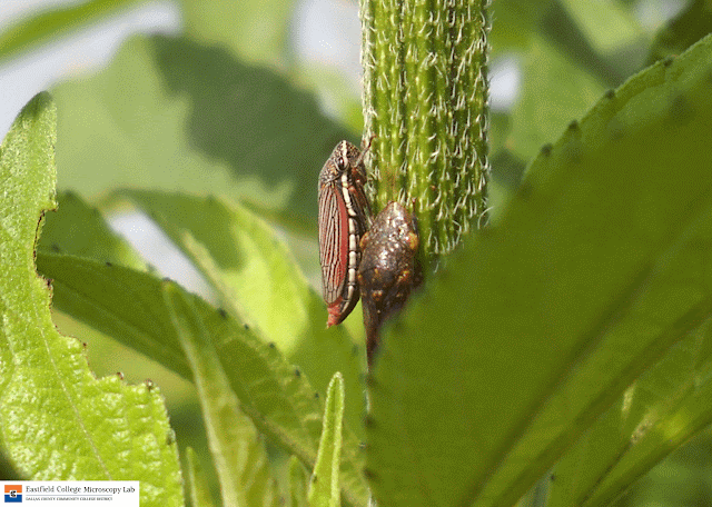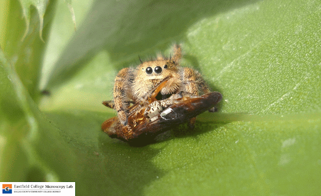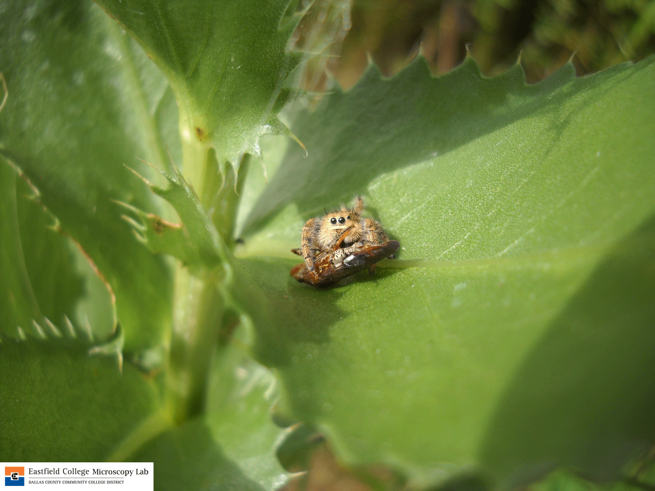 I found one of my favorite spiders - a jumping spider. She had just captured a homopteran that was as big as she was. These spiders have excellent vision and, as I moved around the plant, the spider kept moving to keep facing me.