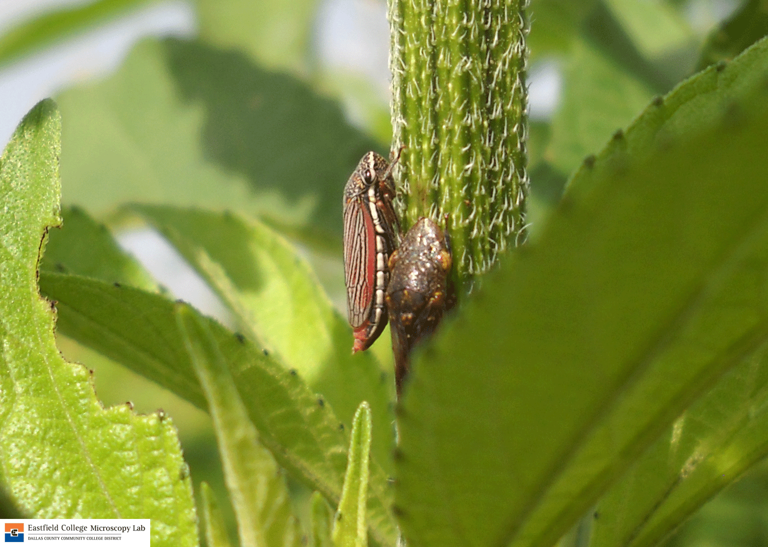 These are beautiful animals. Notice the stripe on the top insect continues through the eye.